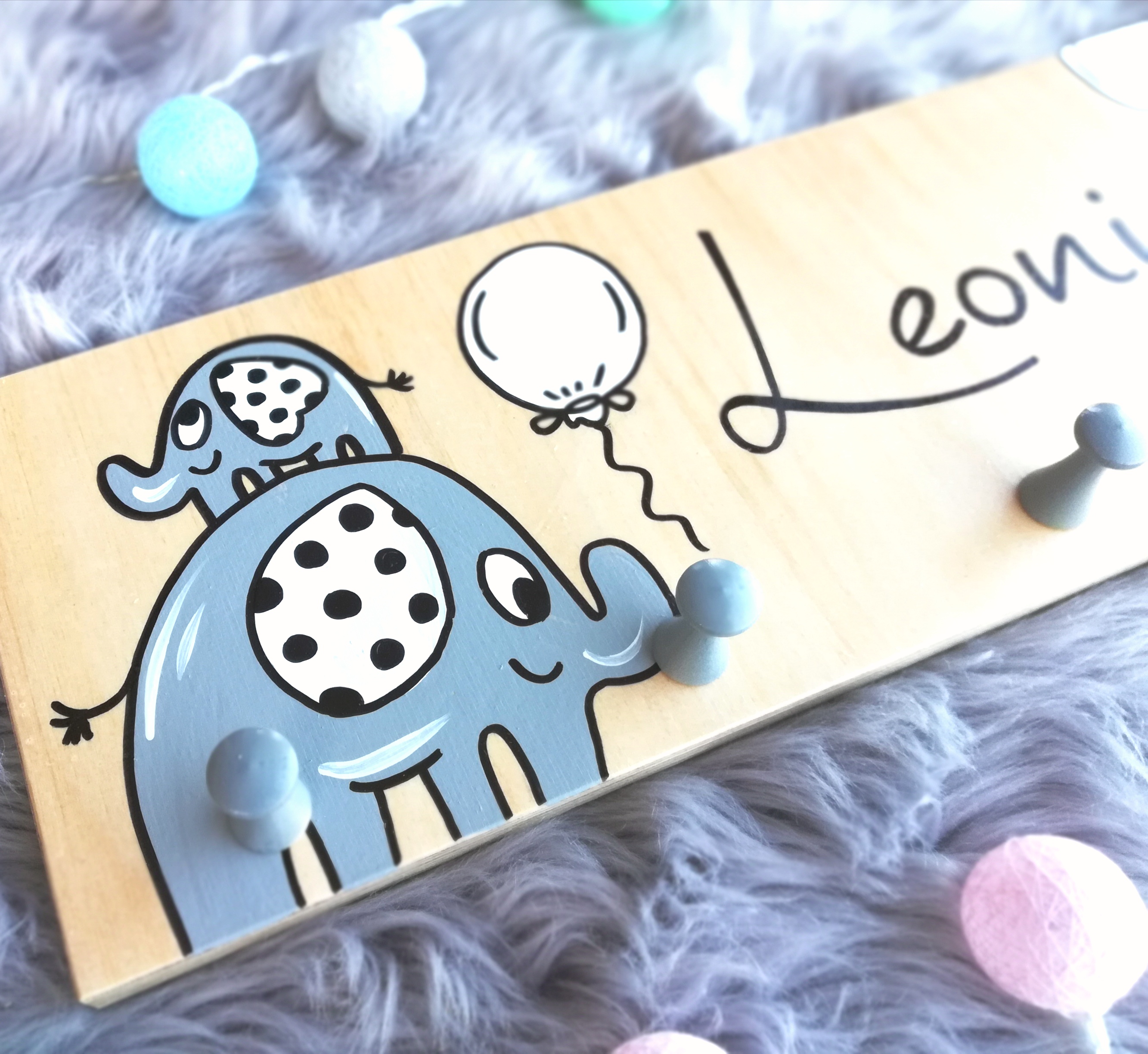 Die handbemalte Kindergarderobe wird im Standardmaß von ca. 15cm Höhe und ca. 55cm Länge angefertigt. Die Kleiderhaken haben einen Durchmesser von 18mm und eine Länge von 41mm und bestehen aus Buchenholz. Bei Geschwistergarderoben liegt die Breite bei ca 65 cm immer abhängig von der Länge der Namen und der Motive.