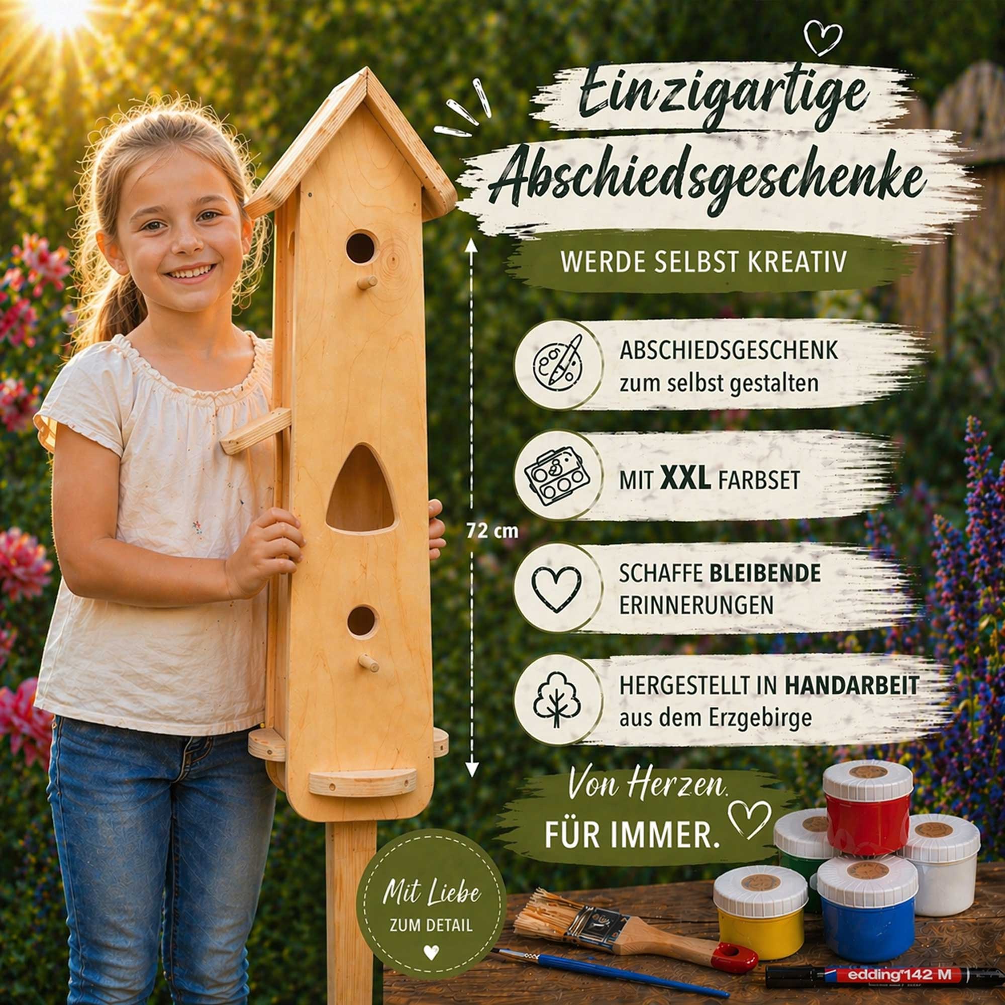 Die passende Geschenkidee zum Kindergarten Abschied. Finden Sie weitere tolle Vogelhäuser als Bausatz zum selbst Bemalen in unserem Shop: Vogelhaus Bausatz zum Kindergartenabschied